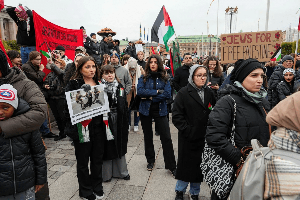 מפגיניפ פרו-פלסטינים מול הפרלמנט השוודי בסטוקהולם. צילום: Hugh Gordon