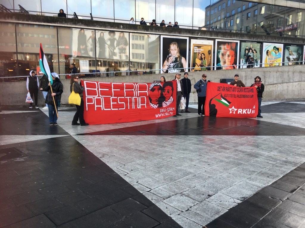 מפגיני הנוער המהפכני הקומוניסטי, RKU (למעלה), תנועת ההתנגדות הנורדית, NMR (באמצע) וחיזב אל-תחריר (למטה). סטוקהולם, אוקטובר 2023. צילום: דיויד סטברו.