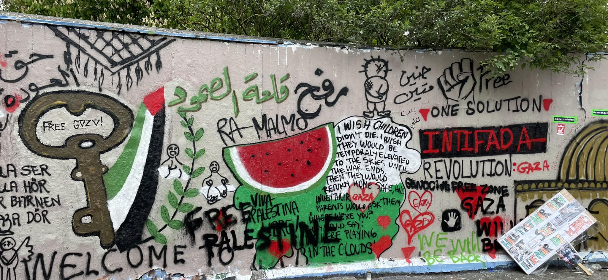 ליד "כפר האירוויזיון", המקום בו אוהדי אירוויזיון חגגו בסוף-השבוע בהופעות, פעילויות לילדים והקרנות חגיגיות של מופעי חצאי-הגמר והגמר, הקימו אקטיביסטים את "כיכר עזה". הוצב בה קיר ארוך ועליו ציורי דגל פלסטין ושאר גרפיטי העוסק בהתנגדות, בירושלים ובזכות השיבה, עם סיסמאות כגון "ברוכים הבאים לרמאלמו!" ו"כבדו את הקיום (הפלסטיני) או צפו להתנגדות".