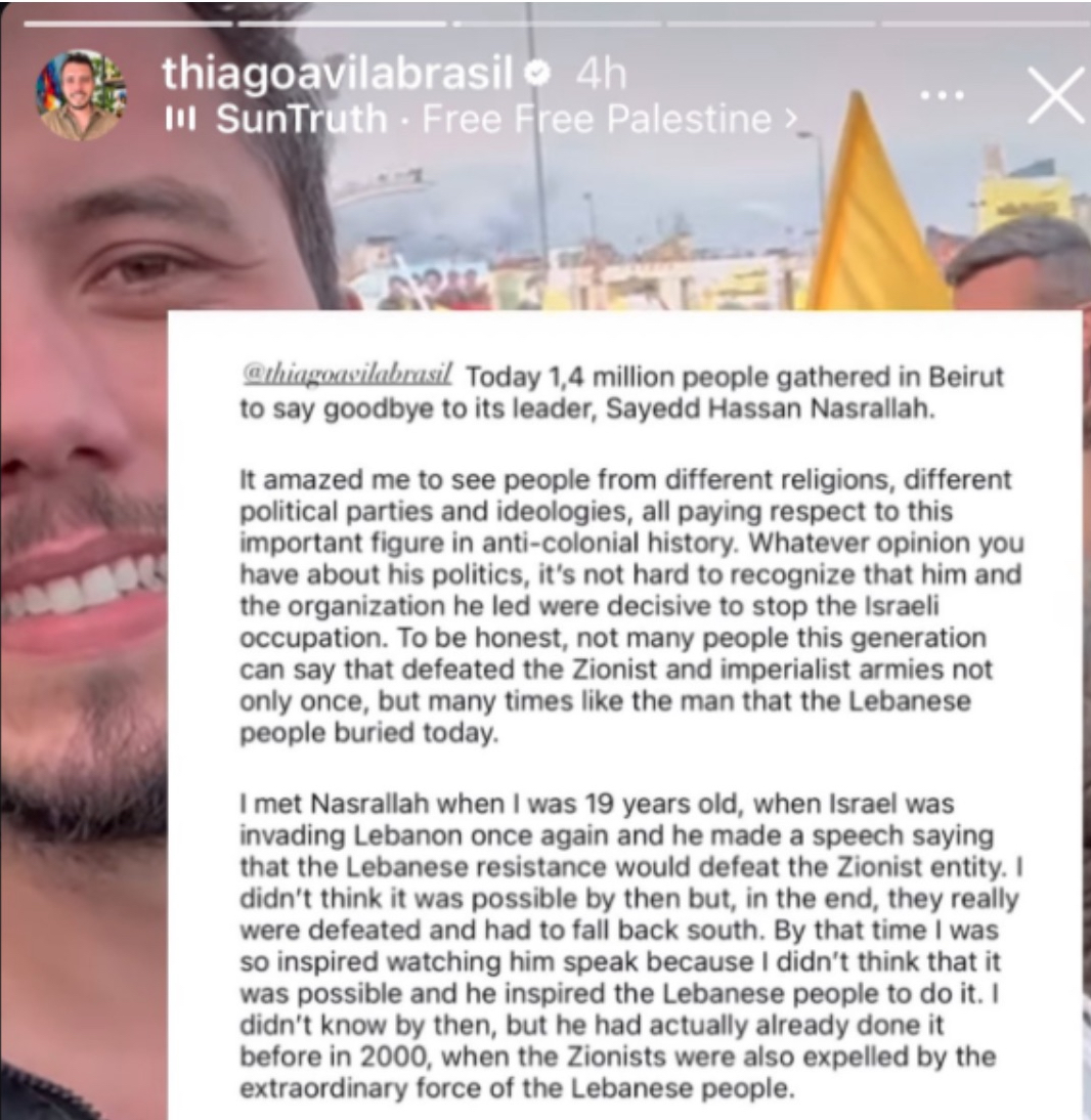 Another committee member is Brazilian activist Thiago Ávila, who has openly expressed his admiration for the late Hezbollah leader Hassan Nasrallah. On social media, Ávila shared how he was inspired as a young man after meeting Nasrallah and described him as “an important anti-colonial figure who defeated Zionist and imperialist armies multiple times.” Earlier this year, Ávila attended Nasrallah’s funeral in Beirut – a massive demonstration attended by tens of thousands of people chanting “Death to Israel” and “Death to America.” Ávila was impressed, writing: “Today I saw thousands of new freedom fighters.”