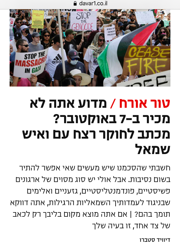 "עבור היהודים בנורווגיה (הקהילה מונה כיום כ–1,500 בני אדם, ד"ס), 7 באוקטובר הוא הדהוד מהמלחמה — תוך ידיעה שזה לא אותו הדבר ושהשואה היא ייחודית. אך החברה הנורווגית לא שמעה את אותו הדהוד. היא שמעה רק את הקול של חמאס, ומהר מאוד הגדירה את ההתקפה כהמשך של הכיבוש. זה היה שוק — שהאמפתיה שהיתה כלפי היהודים בנורווגיה בגלל העבר של השואה, נעלמה פתאום. לא חשבתי לרגע שבימי חיי אחווה עלייה באנטישמיות. כשחקרתי את השואה ואת האנטישמיות, עשיתי זאת כמשהו ששייך לעבר — כדי שזה לא יקרה שוב. ופתאום, המדינה היהודית הותקפה והלגיטימיות שלה הפכה לשנויה במחלוקת. הקול היהודי איבד את הלגיטימיות שלו. סבתי היתה אומרת לי כל הזמן: Die Juden sind schuldig — היהודים אשמים, תמיד. חשבתי שזה משפט מהשטעטל, לא משהו שאשמע בחיי היומיום שלי. יש כאן שינוי בתפיסת האחריות והלגיטימיות — המוקד השתנה והוא לא לטובת הצד שלנו. הפגנתי ביום האישה וחברותיי הפמיניסטיות לא אפשרו לנו להשתתף! הן הטילו ספק אם בכלל התרחשו מקרי אונס בשבעה באוקטובר, ואם אכן התרחשו הן הפחיתו מערכם כאילו מדובר במשהו שקורה בכל מלחמה.